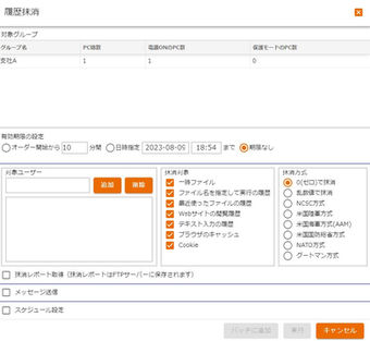クライアントPCの履歴抹消、ファイル抹消、アカウント抹消、空き領域抹消が可能。